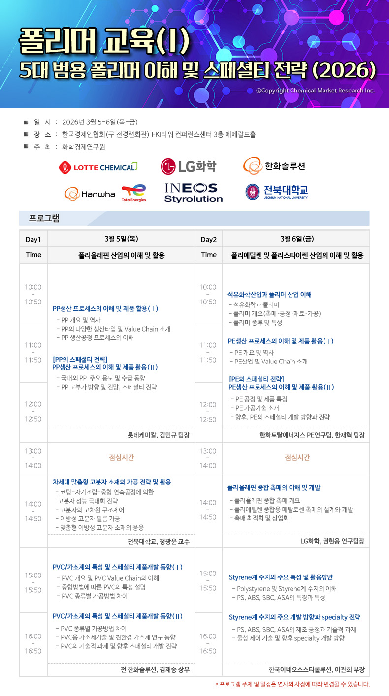 안녕하세요? 화학경제연구원에서는 폴리머교육(Ⅰ) - 5대 범용 폴리머의 이해 및 스페셜티 전략(2026)을 3월 5-6일(목-금)에 개최합니다.