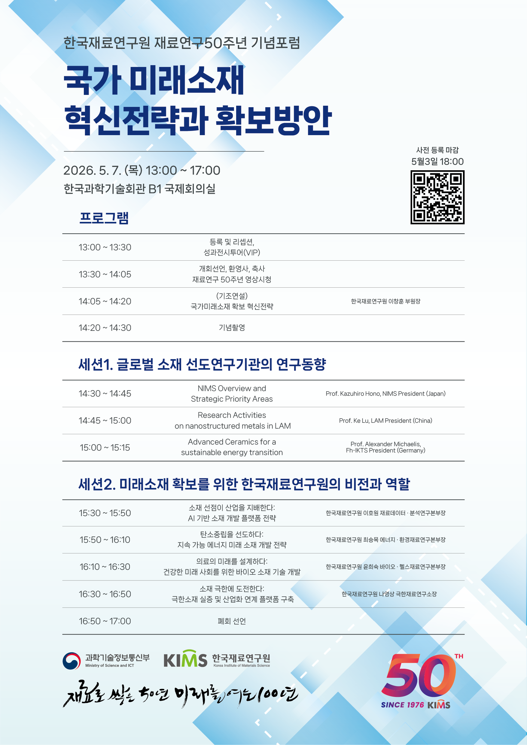 한국재료연구원(KIMS)은 창립 50주년을 맞이하여, 지난 반세기 재료과학·공학 분야의 발전 성과를 조망하고 미래 50년을 준비하기 위한 「한국재료연구원 재료연구 50주년 기념포럼」을 개최합니다.