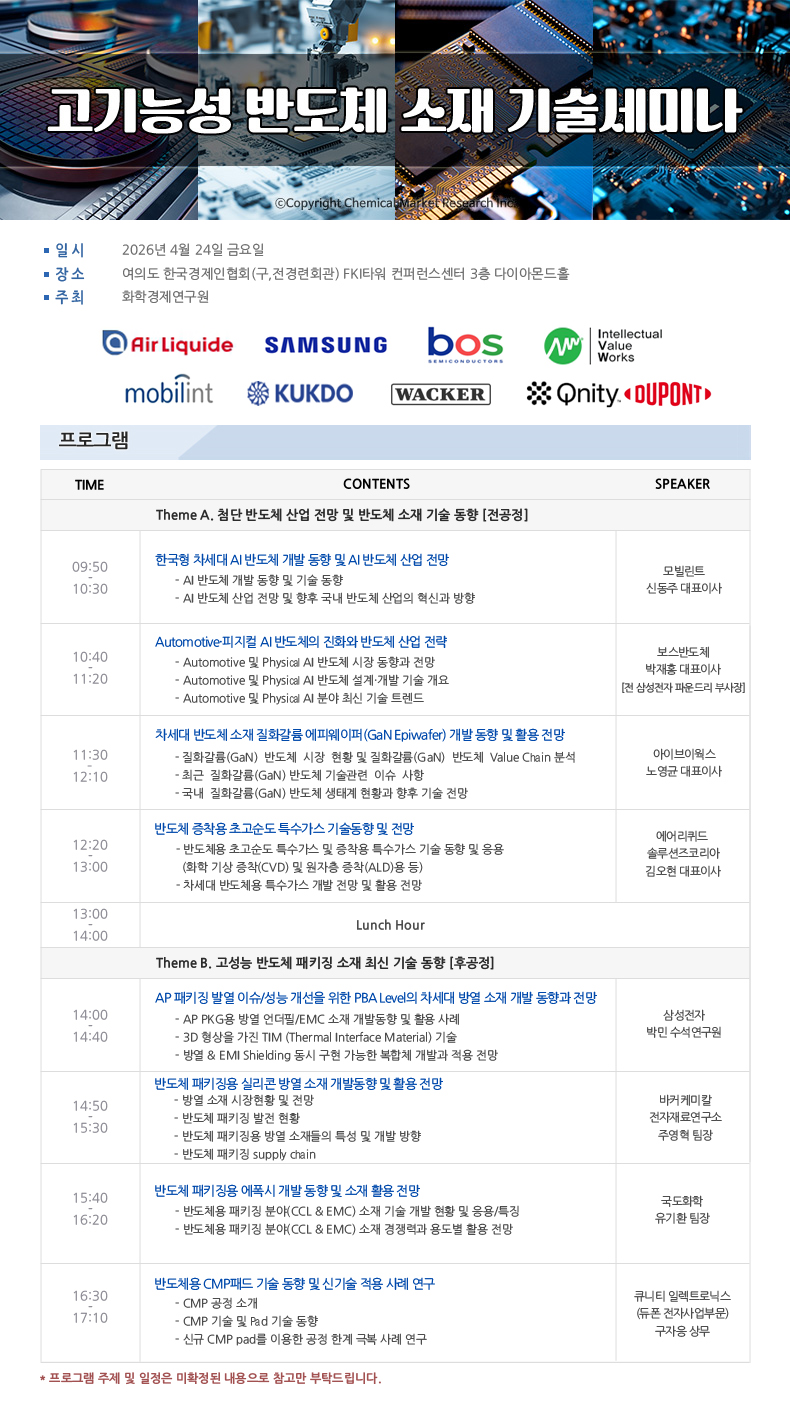 안녕하세요? 화학경제연구원에서는 고기능성 반도체 소재 기술세미나를 4월 24일(금)에 개최합니다.