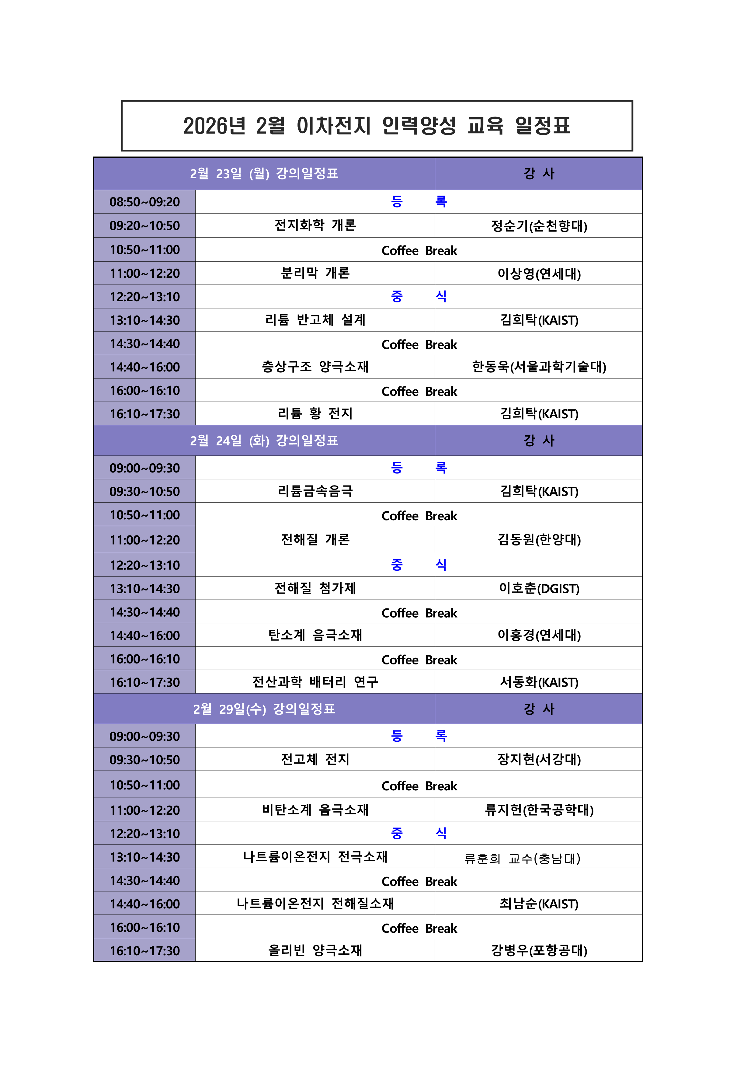 2026년 2월 이차전지 인력양성교육 오프라인 일정표