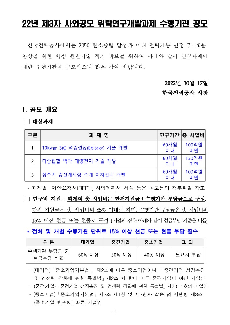 [한전] 2022년도 제3차 사외공모 위탁연구개발과제 수행기관 공모 안내.zip (다운 352회)