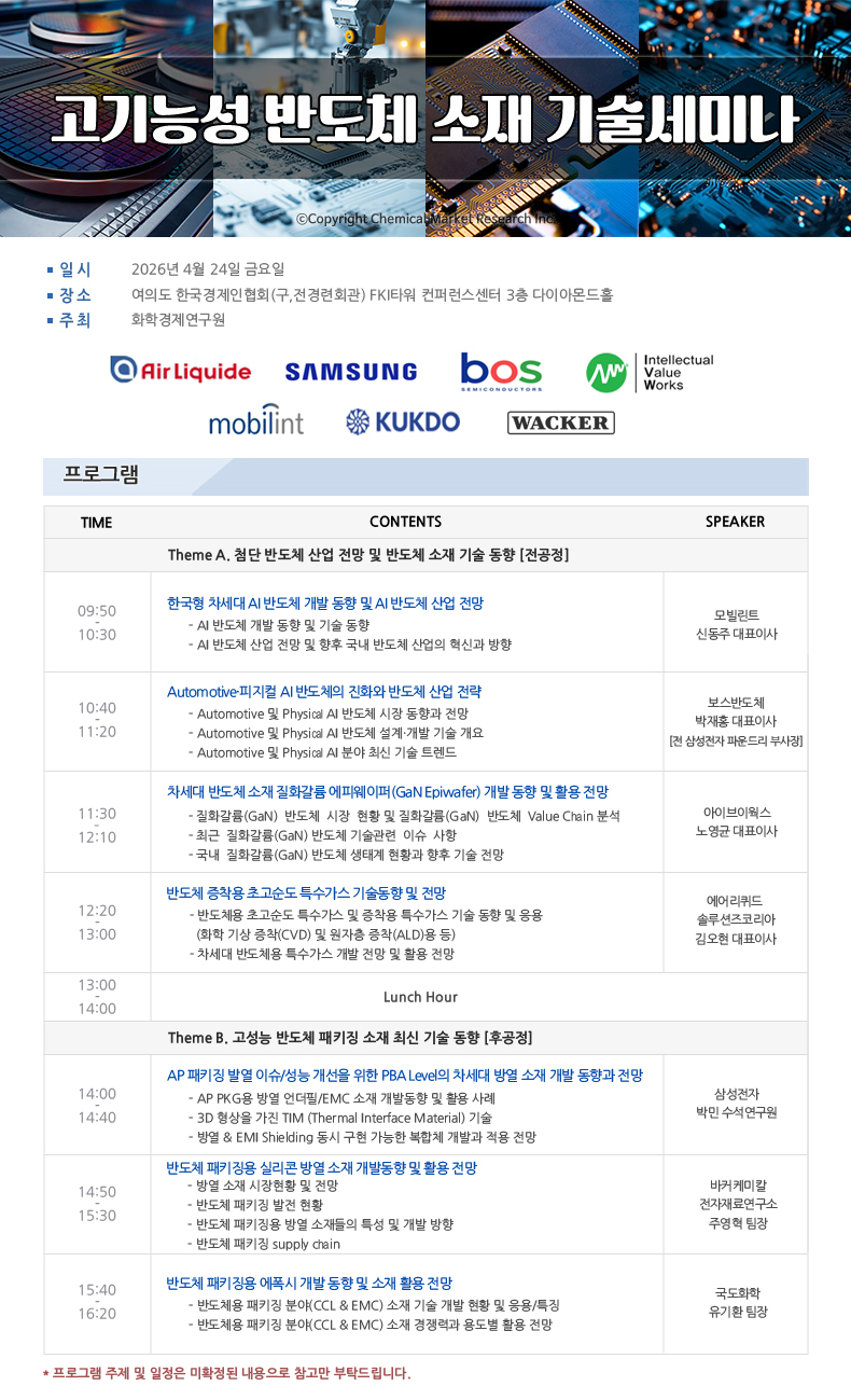 안녕하세요? 화학경제연구원에서는 고기능성 반도체 소재 기술세미나를 4월 24일(금)에 개최합니다.